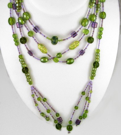 Most of the main beads are lime and olive green. I've combined them with purple Picassos (glass beads with a special lustrous coating),gold-tone metal beads enamelled in lime green, and a central boro lampwork bead by Brendan Blake called Veridian Vapours.