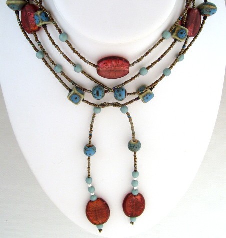 This pretty lariat necklace features foil-lined glass disc beads in a rich cranberry colour. I've matched them with painted turquoise porcelain beads and matt aqua rounds.
