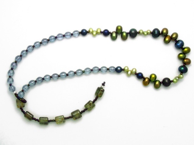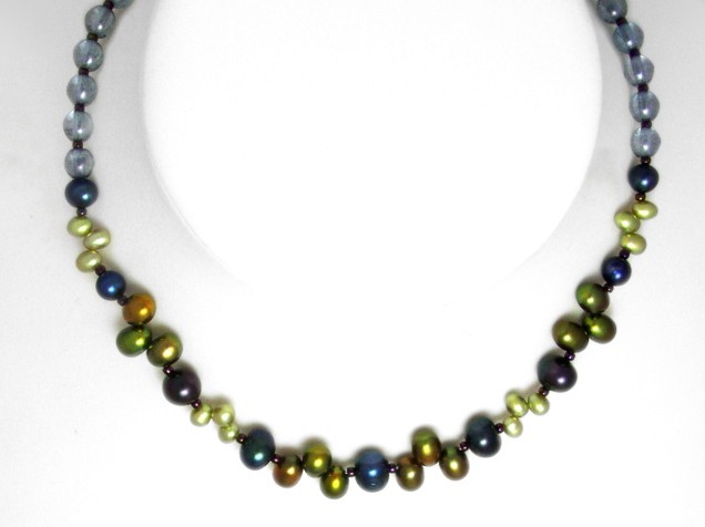 This necklace features freshwater pearls in blues and greens.