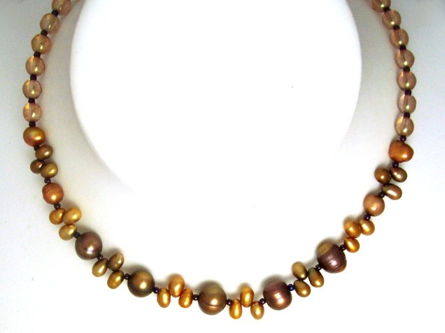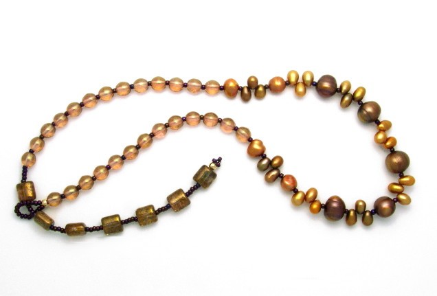 Large brown pearls are joined with trios of copper and bronze pearls.