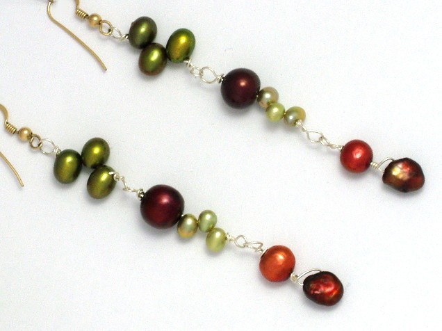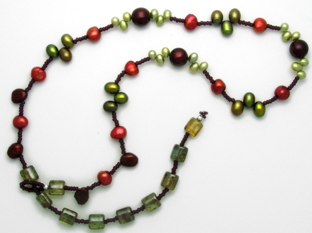 This elegant necklace combines freshwater pearls in ruby red, peachy pink and greens.