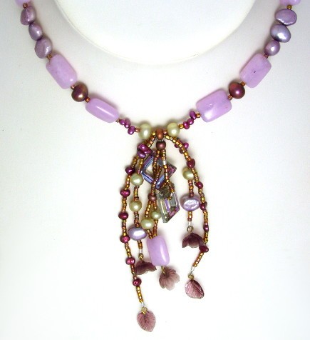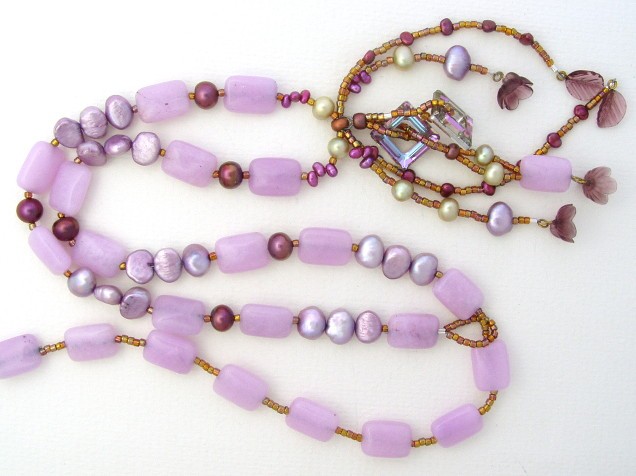 This necklace combines lilac with gold and features lavender jade. I've matched the jade with freshwater pearls in lilacs and deep pink.