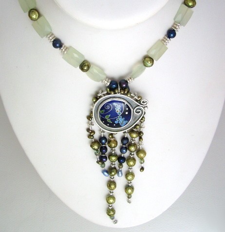 Blue floral enamel prehnite pearl necklace