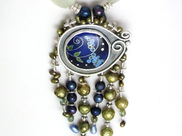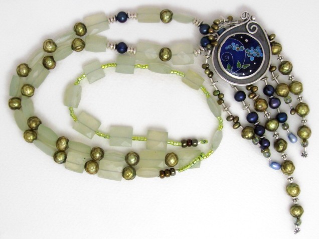 I draped dangles of green and blue freshwater pearls with silver behind the pendant.