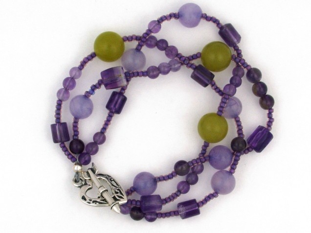 This gorgeous necklace combines semi-precious purple and olive 'jade' serpentine with amethyst.