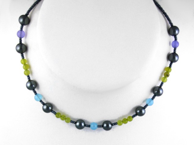 This very pretty but modern necklace combites dark-grey hematite with lagoon blue chalcedony, dyed lavender jade and 'olive jade' serpentine.