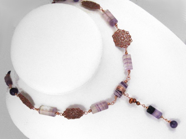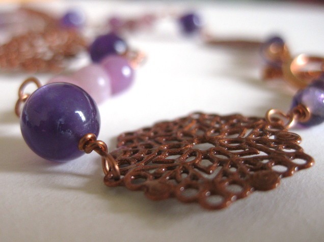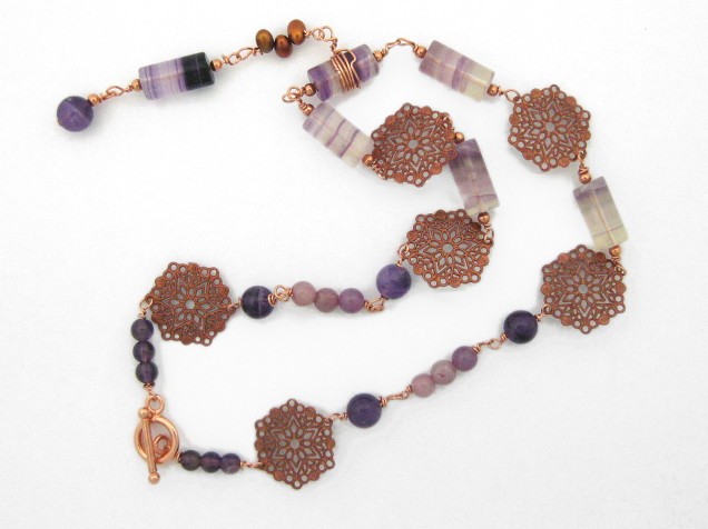 The warm copper colour is matched with purple and white fluorite and dyed jade