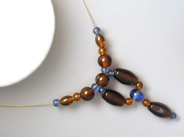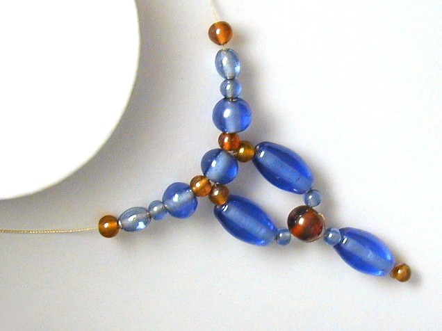 Four sizes of beads in the two colours have been threaded to form an integral pendant.