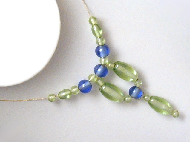 Elegant glass necklace in peridot green and sky blue with gold