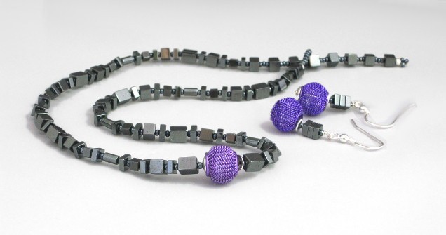 This modern necklace and earring set combines hematite beads in various shapes and sizes with striking purple and mauve metal wire beads.