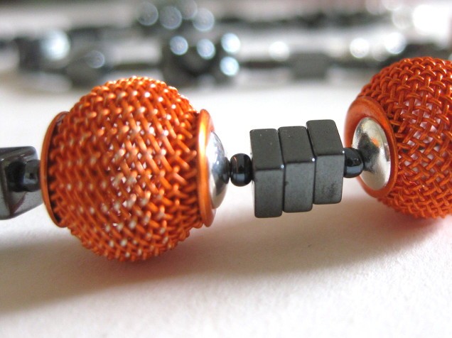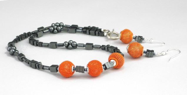 This modern necklace and earring set combines hematite beads in various shapes and sizes with striking orange metal wire beads.