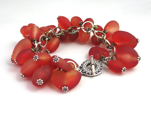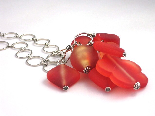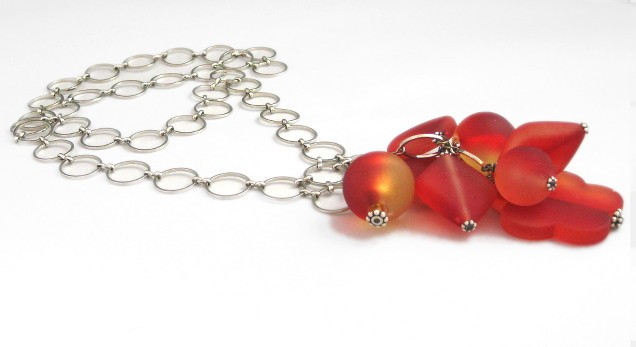 This one-of-a-kind necklace features a cluster of fruity red acrylic beads in various shapes and sizes, including diamonds, rounds and flowers.