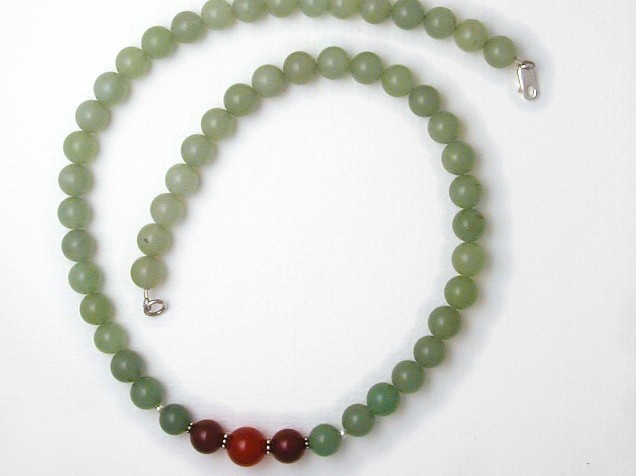 This pretty necklace is made from semi-precious green aventurine and orangey-red carnelian.