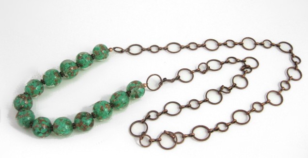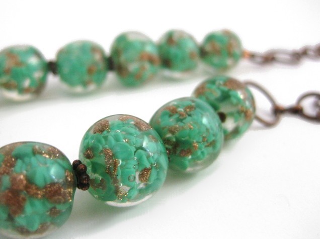 This necklace uses foil glass beads from a 1950s vintage necklace.
