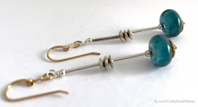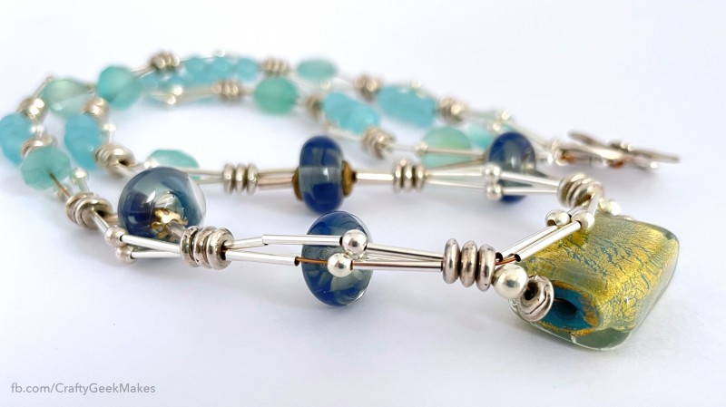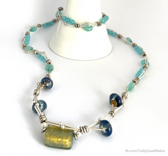 I made this 3-stranded necklace set for myself. It combines chalcedony with sterling silver. The necklace also includes handmade lampwork beads and a glass bead with gold foil. I made a bracelet and earrings to match.