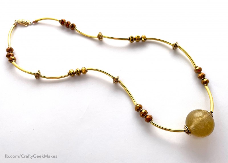 Stunning necklace featuring a large 1" vintage plastic bead with gold specks. I have matched it with gold-tone curved metal tubes, stainless steel discs and coated faceted glass beads.