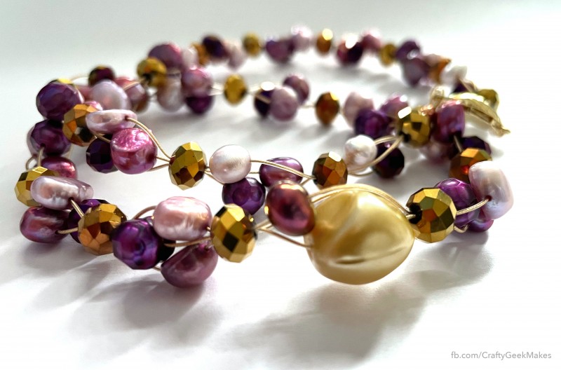 A very pretty 3-strand necklace in yellow, gold, mauve and purple. I designed around a vintage plastic nugget in soft yellow. I matched it with freshwater pearls and coated faceted glass beads