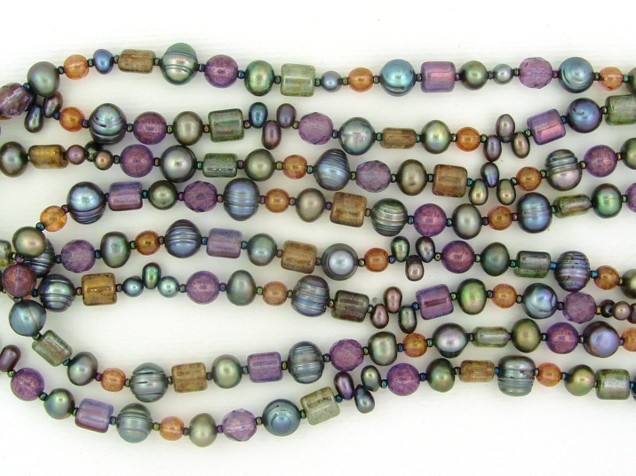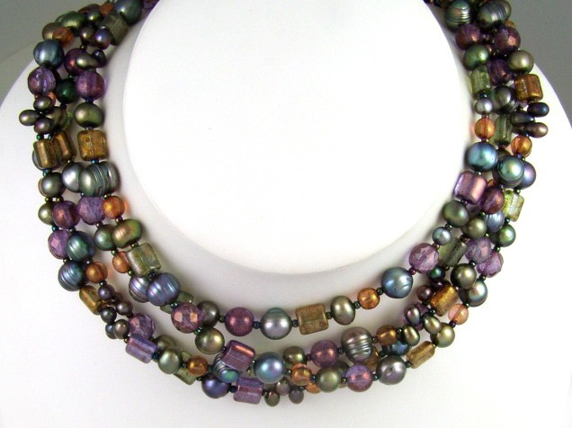 I've alternated four kinds of freshwater pearl - large ridged blue-purple rounds, medium pea-green rounds, and smaller drops and rounds in blues and purples - with Picasso glass beads in brown, purple and green.