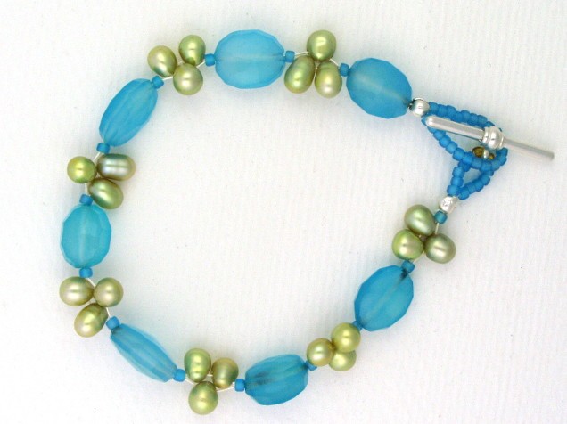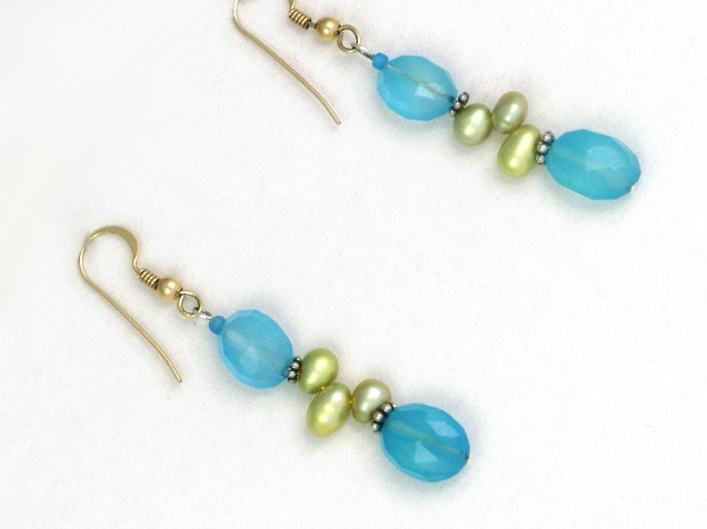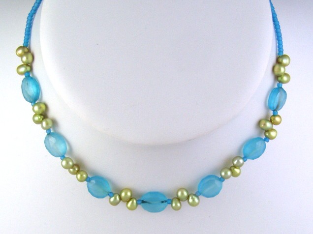 This necklace is made with faceted lagoon blue chalcedony and trios of creamy lime green freshwater pearls.