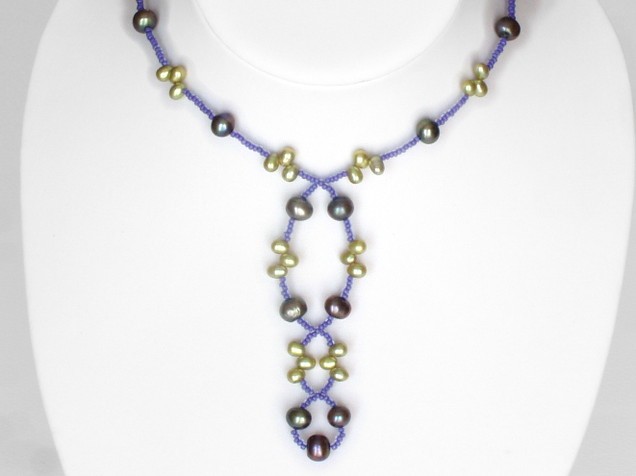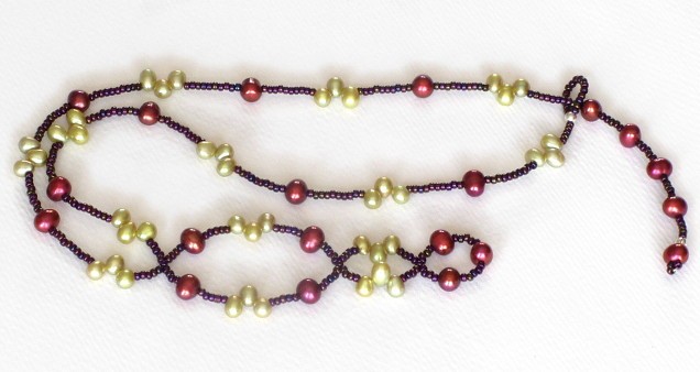 This very pretty necklace combines lime green and rose freshwater pearls. They are separated by tiny glass beads in metallic mauves and gold or purple and yellowy green.