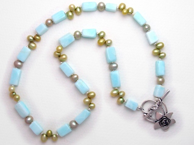 Making this necklace has been an exercise in self-restraint. I'm using dyed Peruvian opal for the first time and I have matched it with freshwater pearls in pale greens, separated by sterling silver findings.