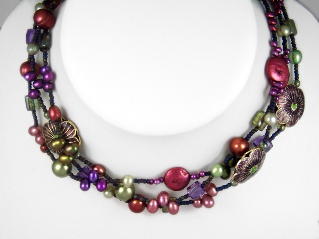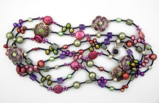 It features lovely large enamelled flowers in brown and green. I've matched these with faceted amethyst barrels, Picasso glass, light green Swarovski crystal pearls and various kinds of freshwater pearls.