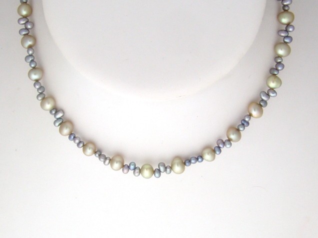 This necklace was a commission made for a gift. It combines pale yellowy-green freshwater pearls with trios of silver freshwater pearls.