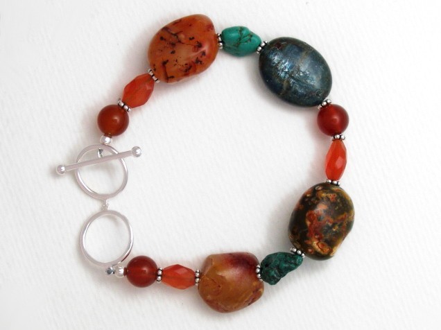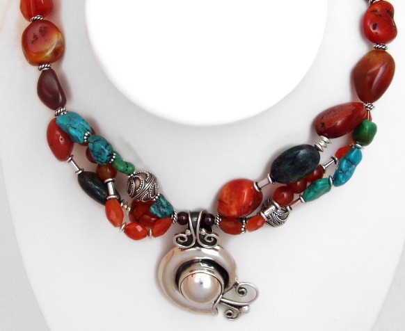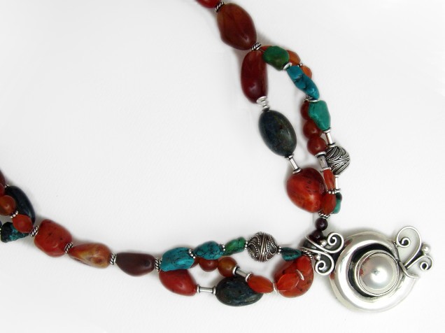 I combined chunky semi-precious stones in oranges and turquouse with a sterling silver pendant.