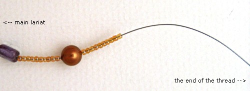 5) After beading your lariat and you reach the other end, start to thread the end beads, including the two crimps and the final three seed beads.