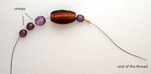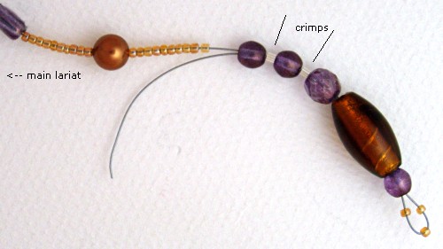 Thread the beads which will be at the end of the lariat, including two crimps, separated by one or more beads.