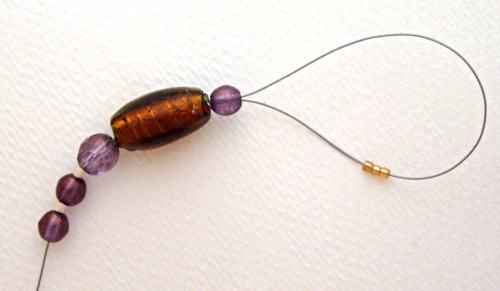 Finally, thread three seed beads. Except for the seed beads, all of these threaded beads must have holes big enough for the beading wire to go through twice.
