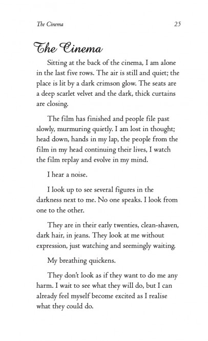 "'The Cinema' is my favourite story! It starts off innocently enough and quickly escalates into a semi-dangerous situation. The abruptness with which it ends also factors into the making of one of the best short stories I've ever read!" Clarissa F.