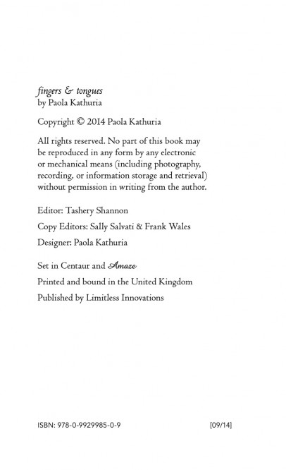 "Frequently when I read a book of short stories they tend to feel formulaic; however, this was not the case with fingers & tongues. I would not have been surprised if this was an anthology of short stories written by a variety of authors. And so I am genuinely impressed with Paola's versatility as a writer.