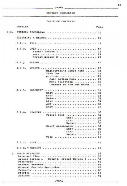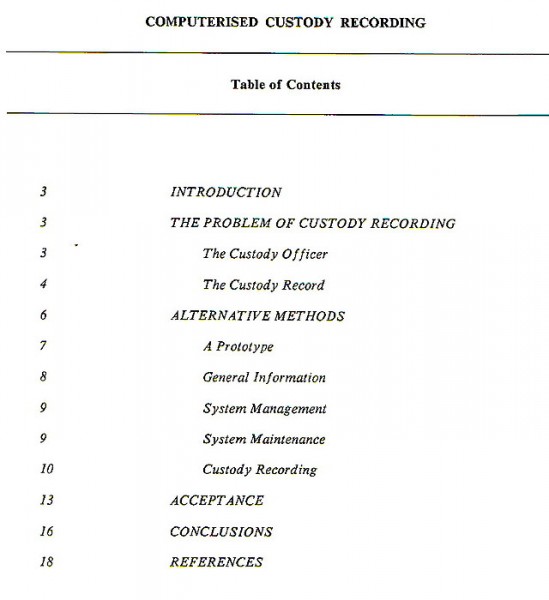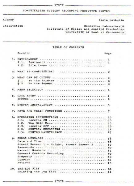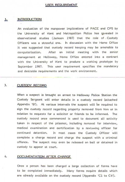 With the support of the Home Office Scientific Research & Development Branch and the Metropolitan Police, I developed a prototype to computerise the Metropolitan Custody Record in Turbo Pascal.