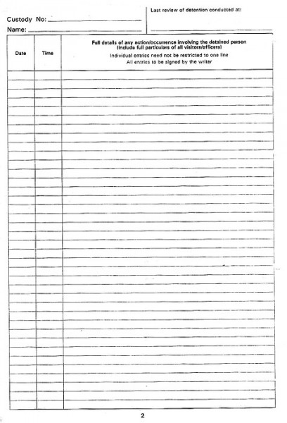The Custody Record is a multi-page form that officers fill in when someone is charged and is in custody at a police station. It is used to log their details and events, such a lawyer visits.