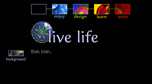 My web site had black page backgrounds and section buttons based on photos and imagery used on the site. I applied a filter to unselected section buttons to give them a painterly feel. Selected buttons were in the original photographic style. The 2002 redesign removed my photo from the home page and several sections of the site.