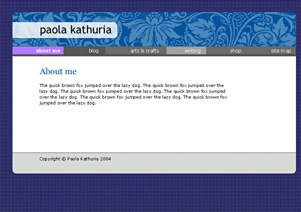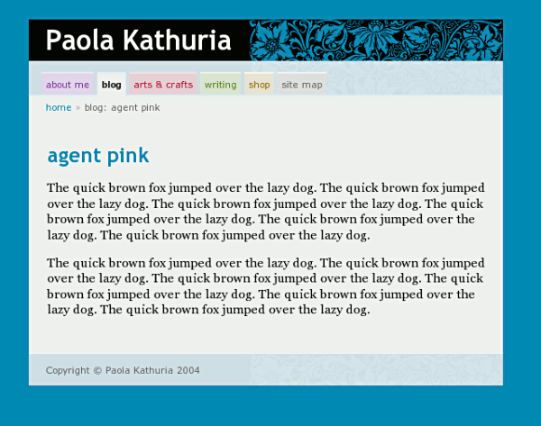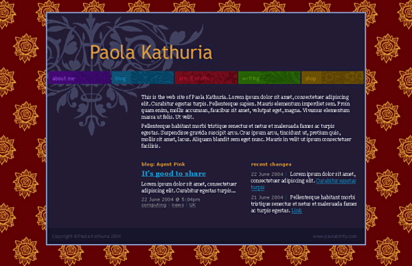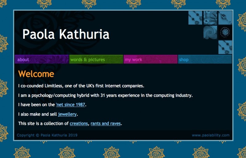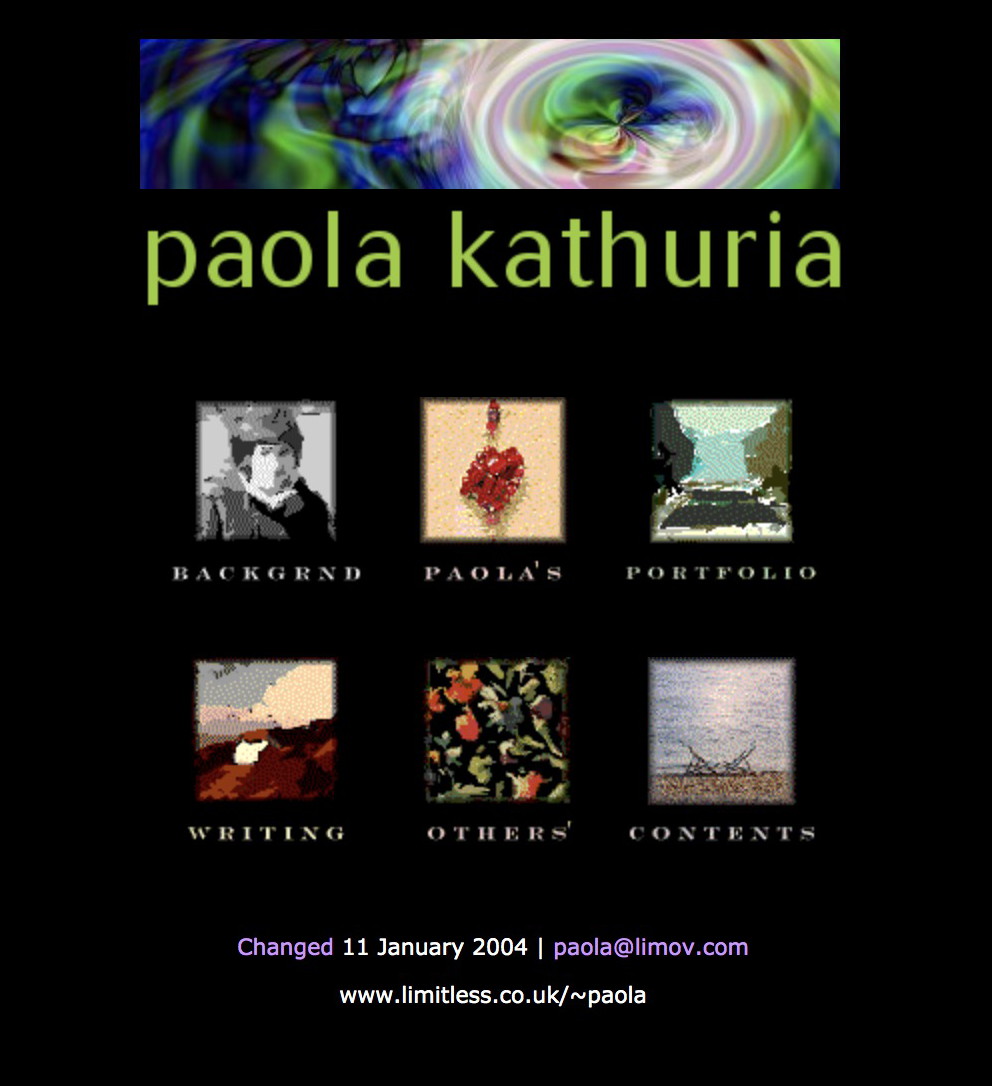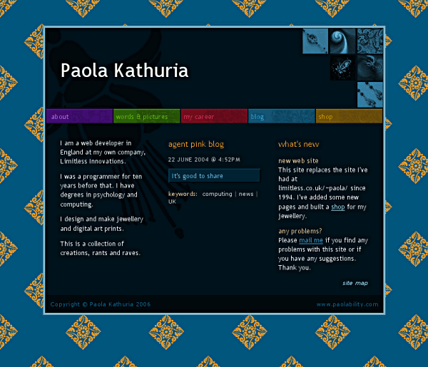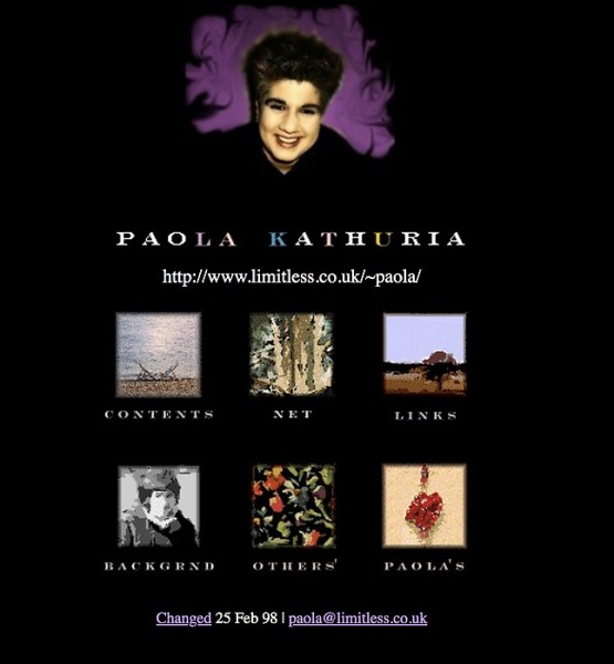 My first web site was launched in 1994 at www.limitless.co.uk/~paola. I redesigned it in 1996 to have a black background and did a minor redesign in 1998. The new design for paolability.com was done in 2004. I worked on building the site off and on since then, finishing in 2006.