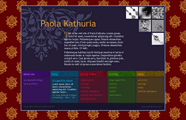 Jun 2004: I sent Francois a mock-up of my latest page design. As usual, I wanted to colour- and graphic-code each site section. I'd done as much as I could and wanted help to make more use of the decorative images and to make the design professional since I planned to add a shop to the site.