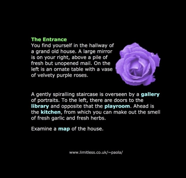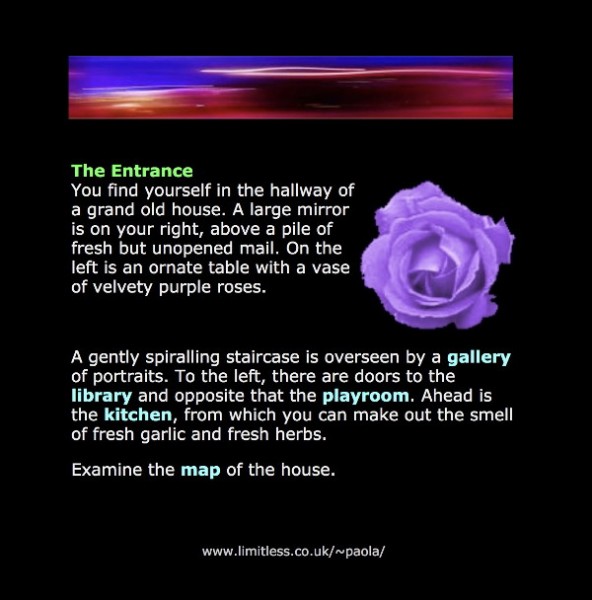 Mar 2000: I tried a MUD route. In old text-based games such as Adventure and MUD, you explore a fantasy world. Each location ('room') is described in a standard format:
