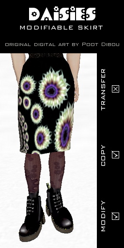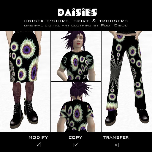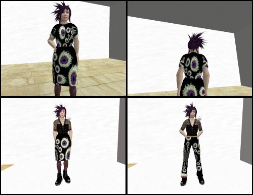 I put them in shops (in rented space within SL and in the Second Life Marketplace) as a set of t-shirt, skirt and trousers in each design as well as a multi-pack.
