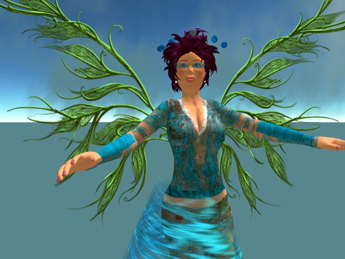 The skirt was based on the built-in template. I applied a water texture which I found in the SL texture Library. I then added a script so that it would react to wind and my avatar's movement. The texture slowly rotated.