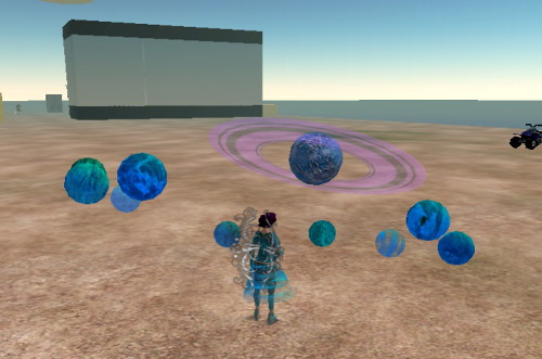 To build it, I went to one of the SL sandboxes. I made each orb at large scale, applied different textures, tinted them blue and scripted each to slowly rotate. I then linked them into a ring, which I scripted separately to rotate. When I was happy with how it looked, I shrunk it down in size and attached it to my avatar's head.