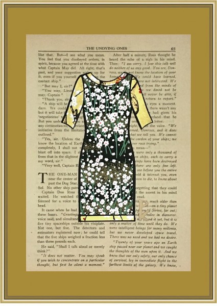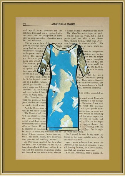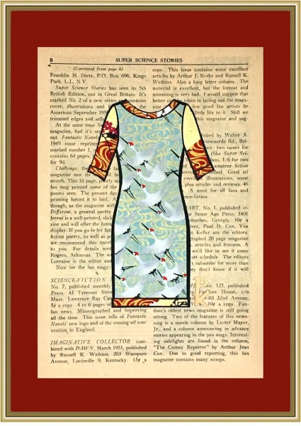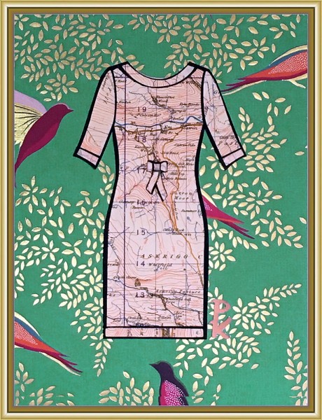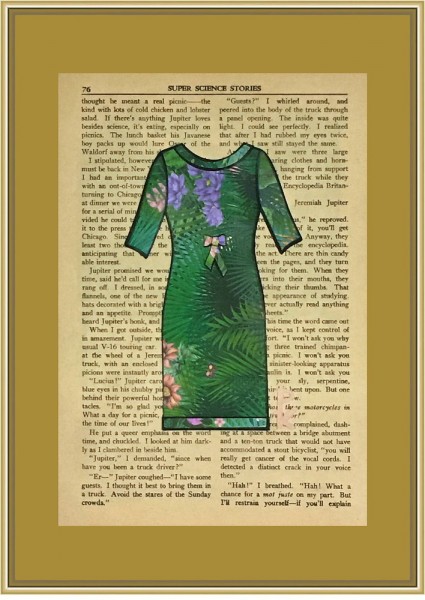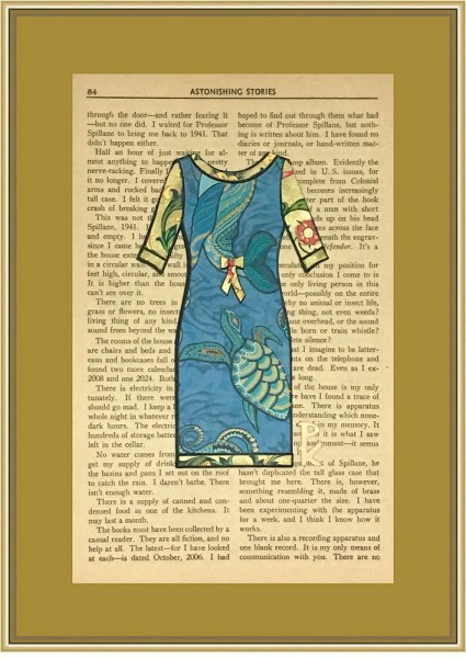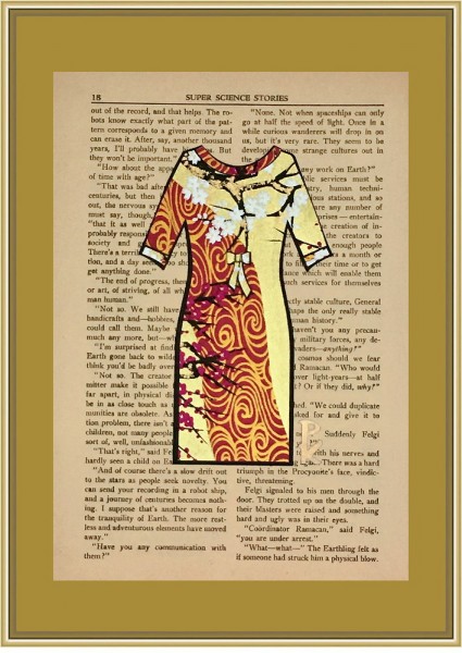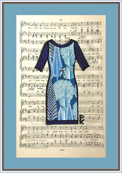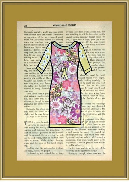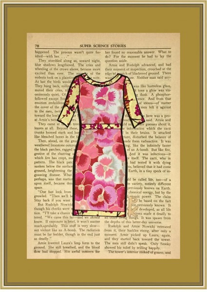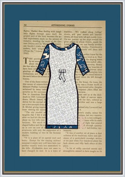 In July 2020, during UK lockdown due to Covid-19, I had the idea to make original dress designs from my teens in the decorative wrapping paper I'd been collecting for a couple of decades and mount them on vintage book pages.