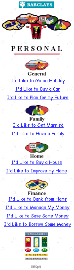 The site was divided into three main sections: Personal, Business and About Barclays. Denison Design chose a graphic theme and colour for each section (the ubiquitous red, green and blue) and applied these consistently to page elements, such as the page tile, list bullets, section graphics, and navigation buttons.