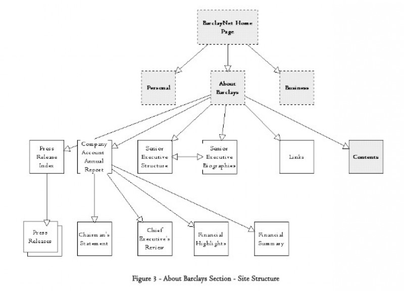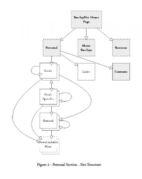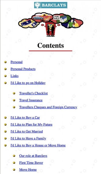 The resulting site structure meant that different kinds of visitors would be able to get to the content they wanted: people who knew exactly what they wanted (e.g., traveller's cheques) could use the product index; people who wanted to know what Barclays Bank could do in their current situation would use the list of the goals and would then only read what was relevant to them.