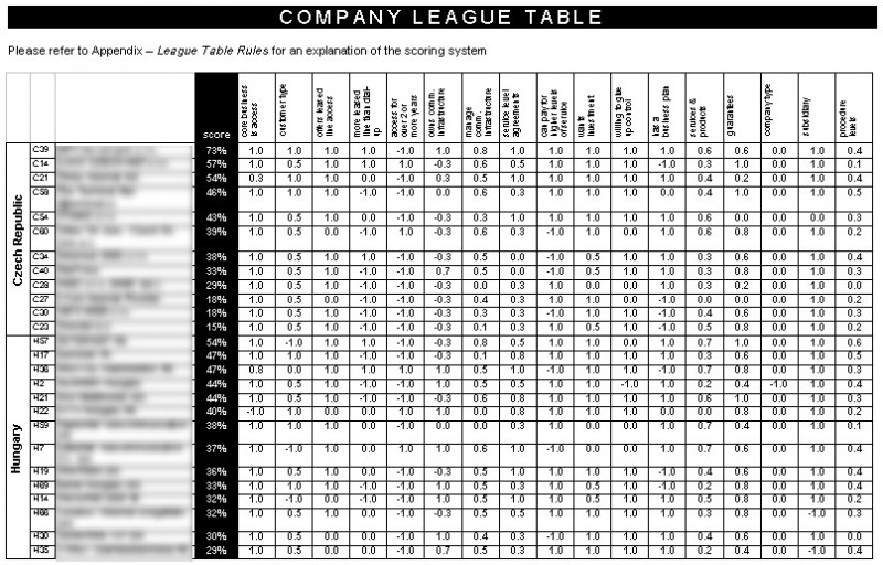 We also created a one-page overview comparison table called the Company league table. To make it, we created a scoring system based on the client's company selection criteria. The scoring system was then applied to all the companies to produce a ranking.