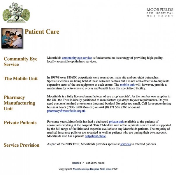 Working with a very small budget, the Moorfields web site started as a handful of pages in 1996. Paola based the design on colours and photos from annual reports and then added new content from Moorfields to the site.