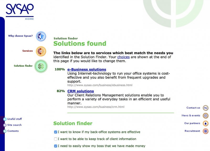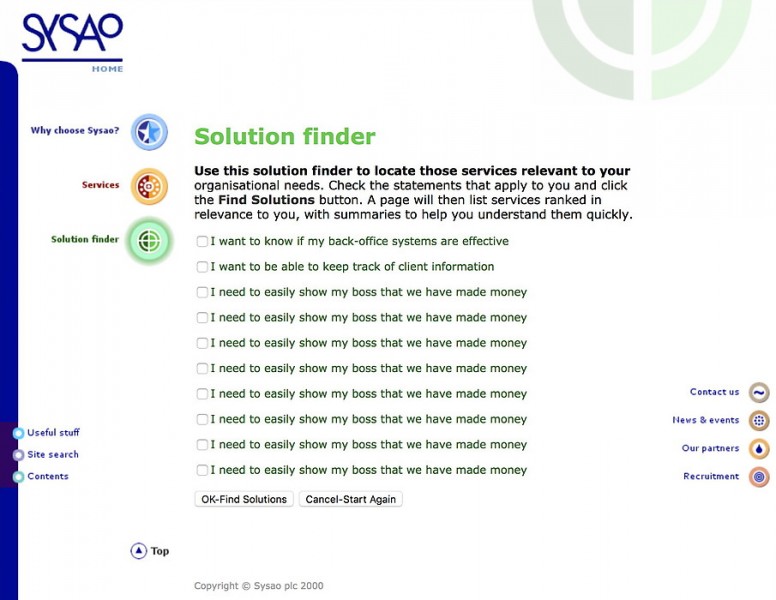 The solution finder was a specialised site search. Specific pages on the site would be associated with goal questions. The solution finder would pose these questions alongside checkboxes. A visitor was to tick those boxes that applied. On submitting the form, the form would redisplay after an annotated list of pages on the site which addressed the ticked questions.
