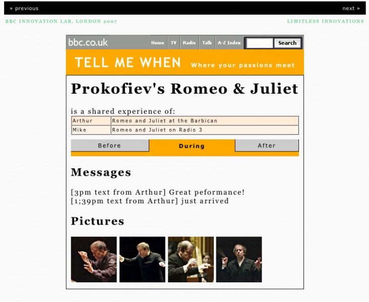 We introduced the idea that people can come together in Before, During and After pages for an event, such as a televised football match or concert. We illustrated the idea by using the scenario of a father and son getting together on Tell Me When, when the son was away at university.