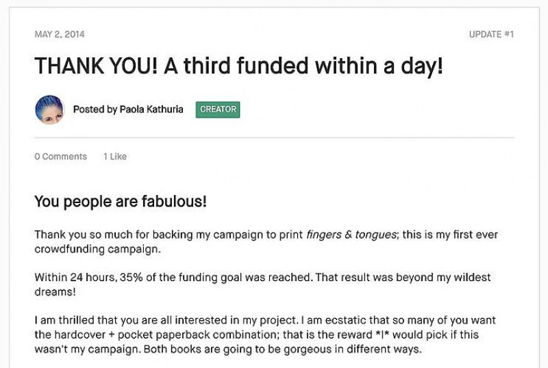 I kept backers informed to the progress I wasd making at each stage: editing, design, printing, delivery.